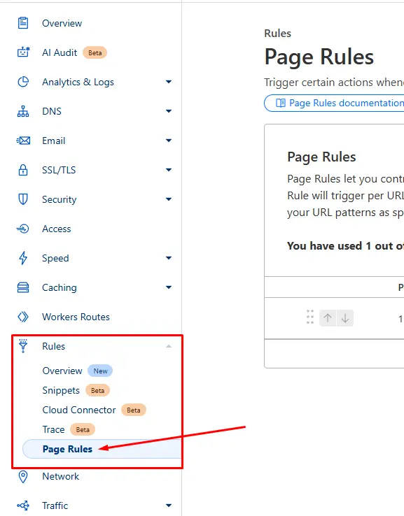 Cloudflare giriş yapıyoruz, işlem yapmak istediğimiz siteyi seçiyoruz. Sol menüde bulunan “Rules” altında bulunan “Page Rules” sayfasına gidiyoruz.